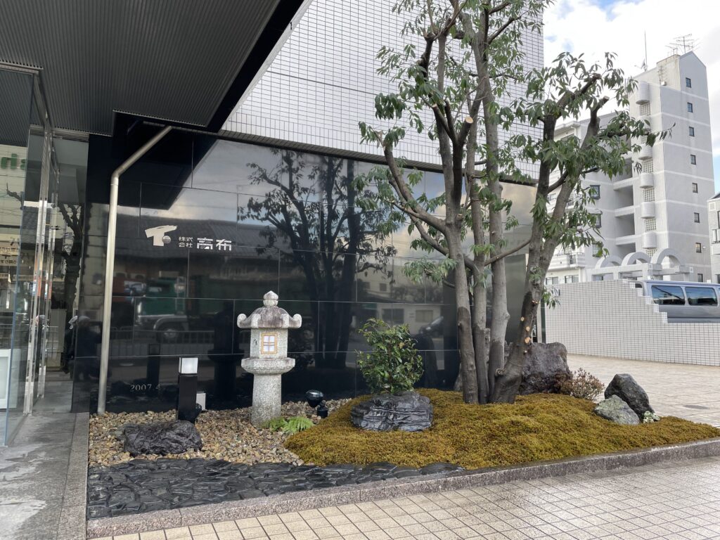 会社エントランス横の庭園。会社のヒット商品にちなんだ八角形の灯籠を使用。竹垣は白竹と黒竹で市松模様を作り、和モダンを表現した。