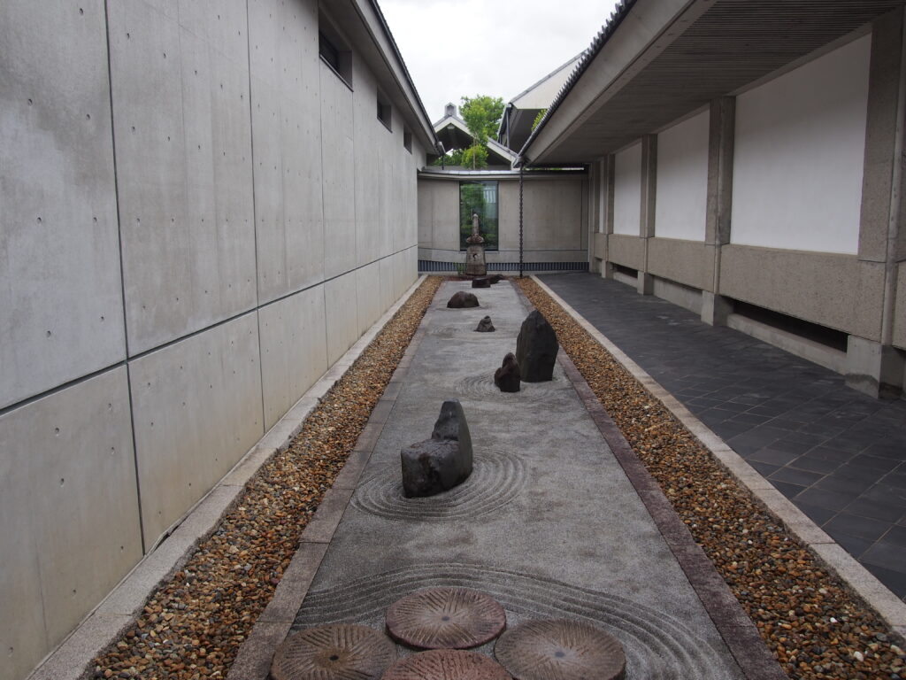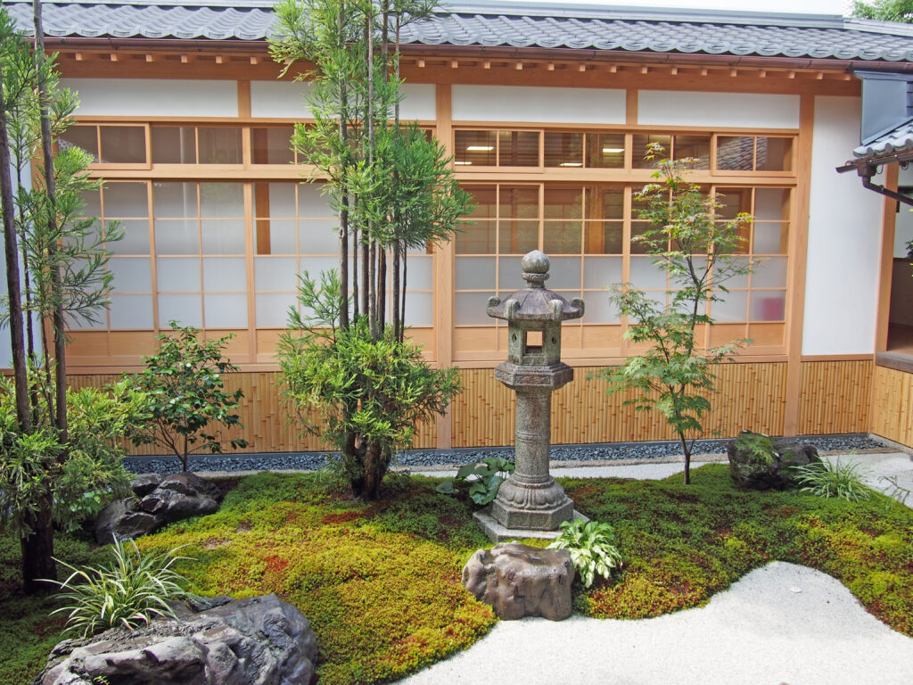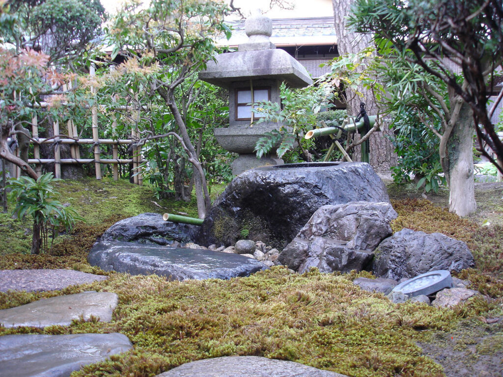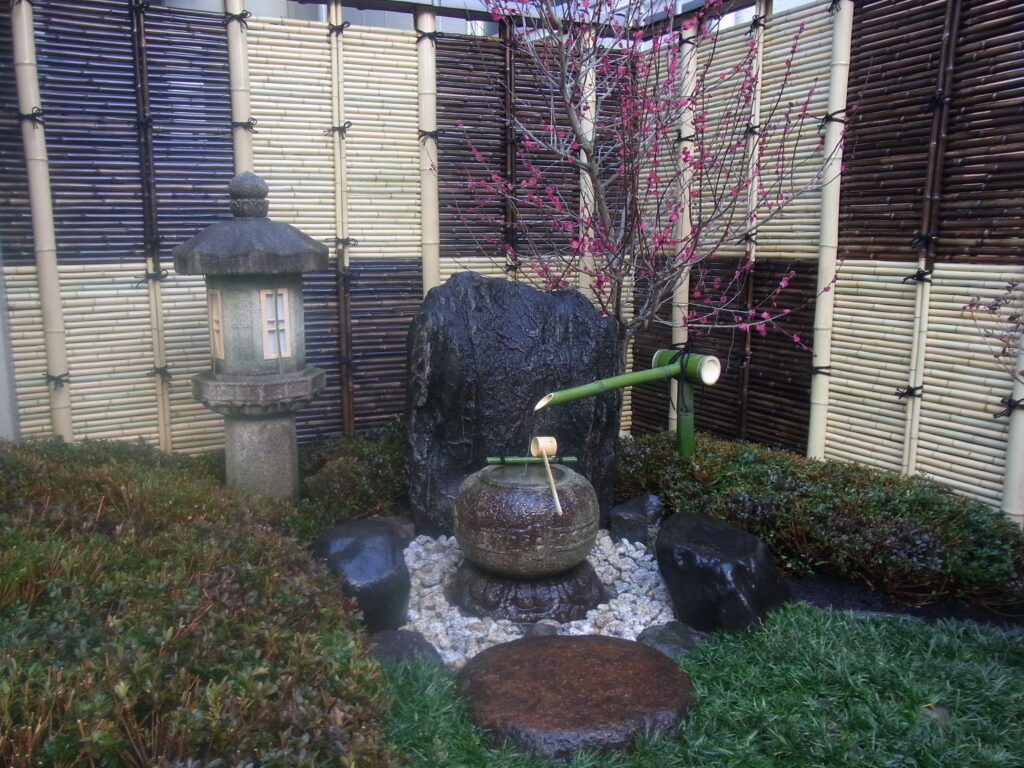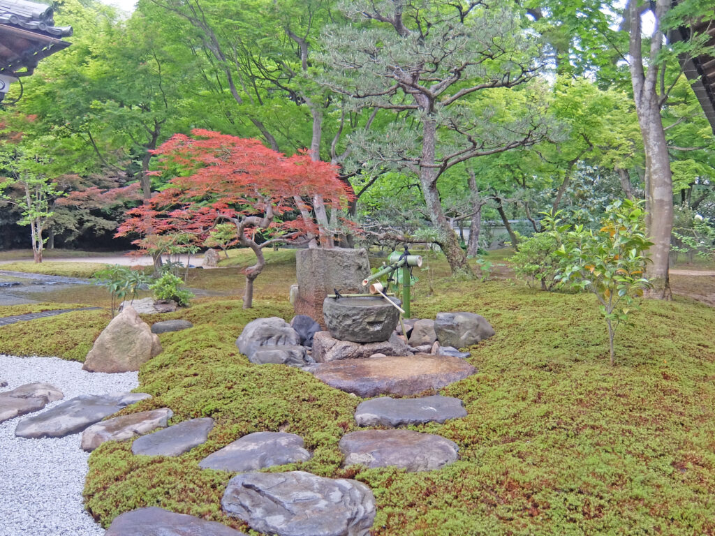 二つの建物に挟まれた中庭。どちらの建物からも美しく見えるよう立ち蹲を中心に据え、お互いの目線を程よく遮るように植栽を行っている。