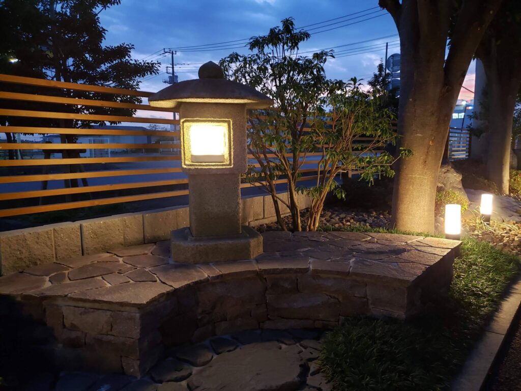 幅2m・長さ30mほどの緑地帯の作庭。既存のケヤキを主木として利用。玄関正面に鉄平石の石組と創作灯籠を配置し、視線を誘導している。