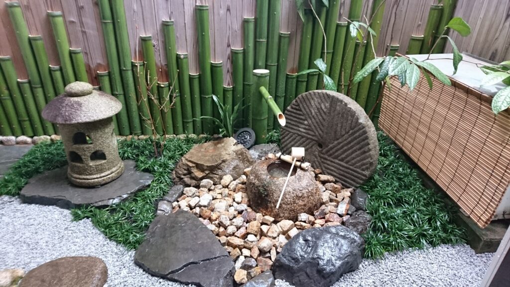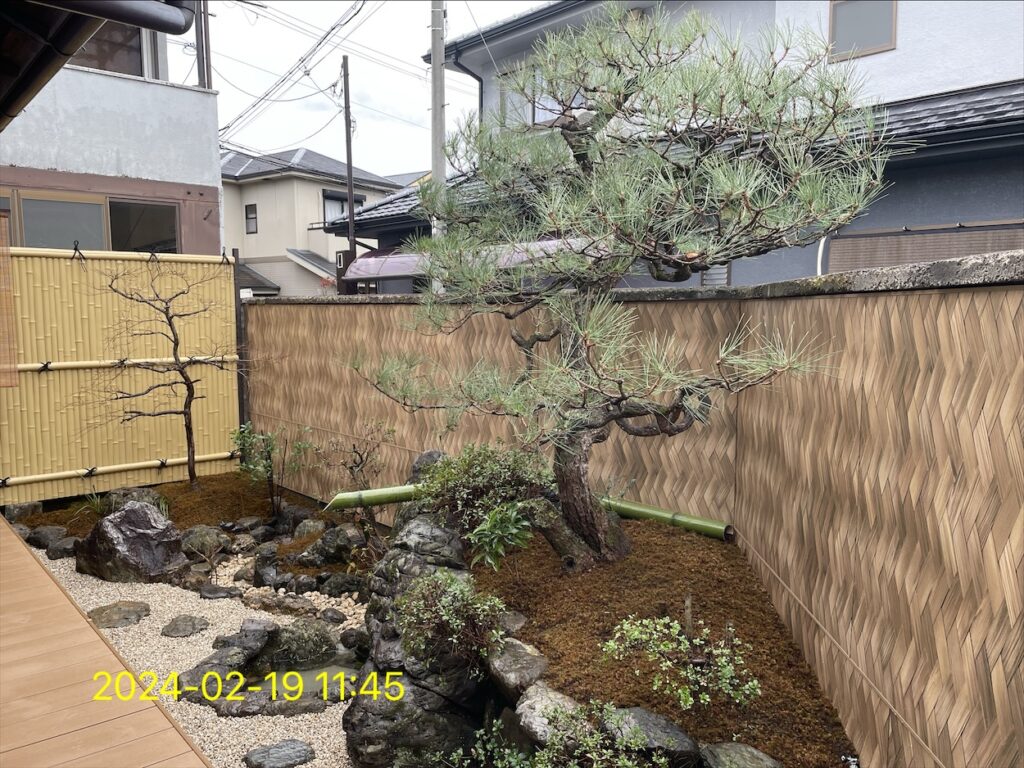 既存の坪庭の改修工事。スペース的に起伏をつけるのが困難だったため壁面にランダムに青竹を貼り、立体感を演出した。